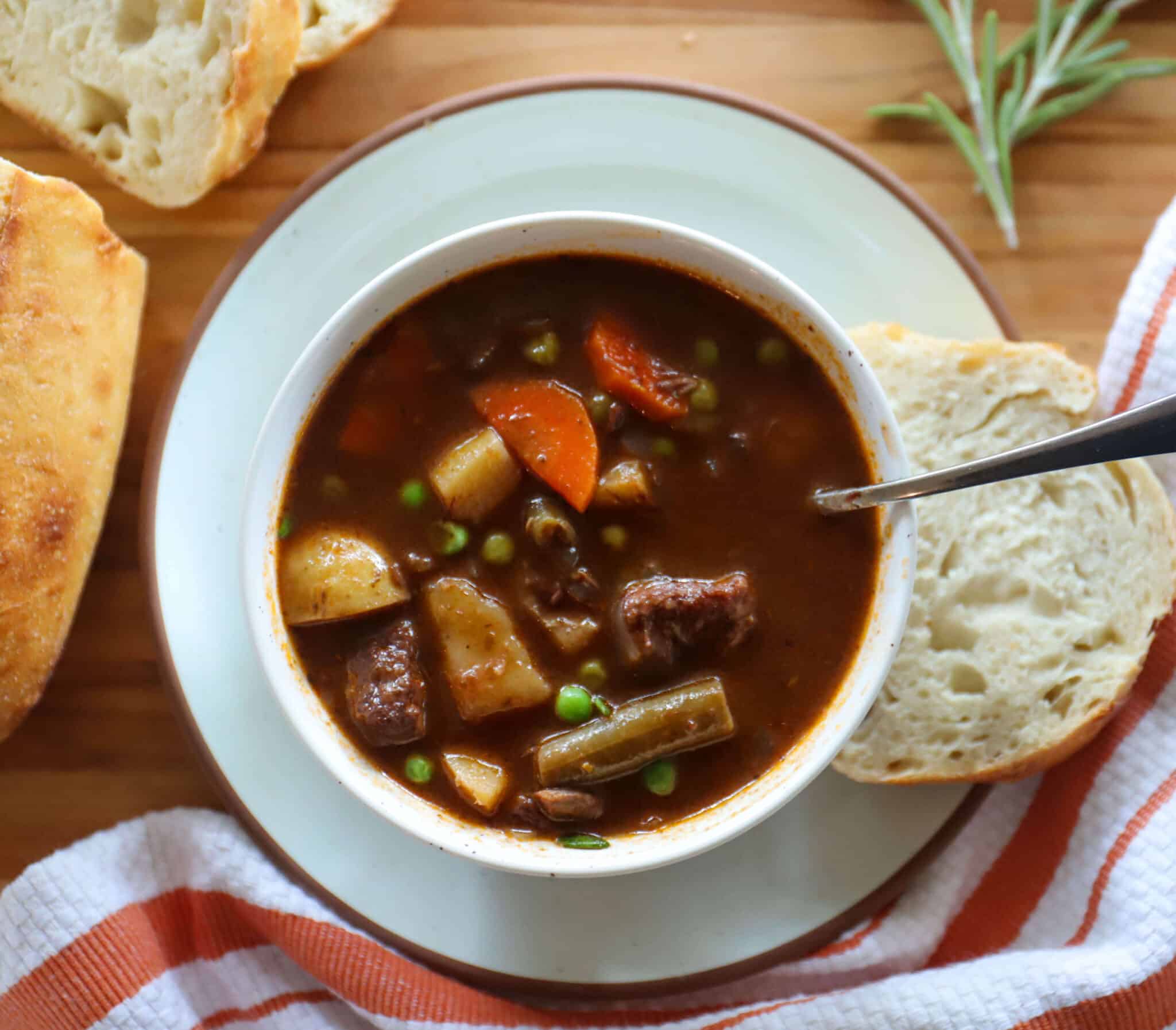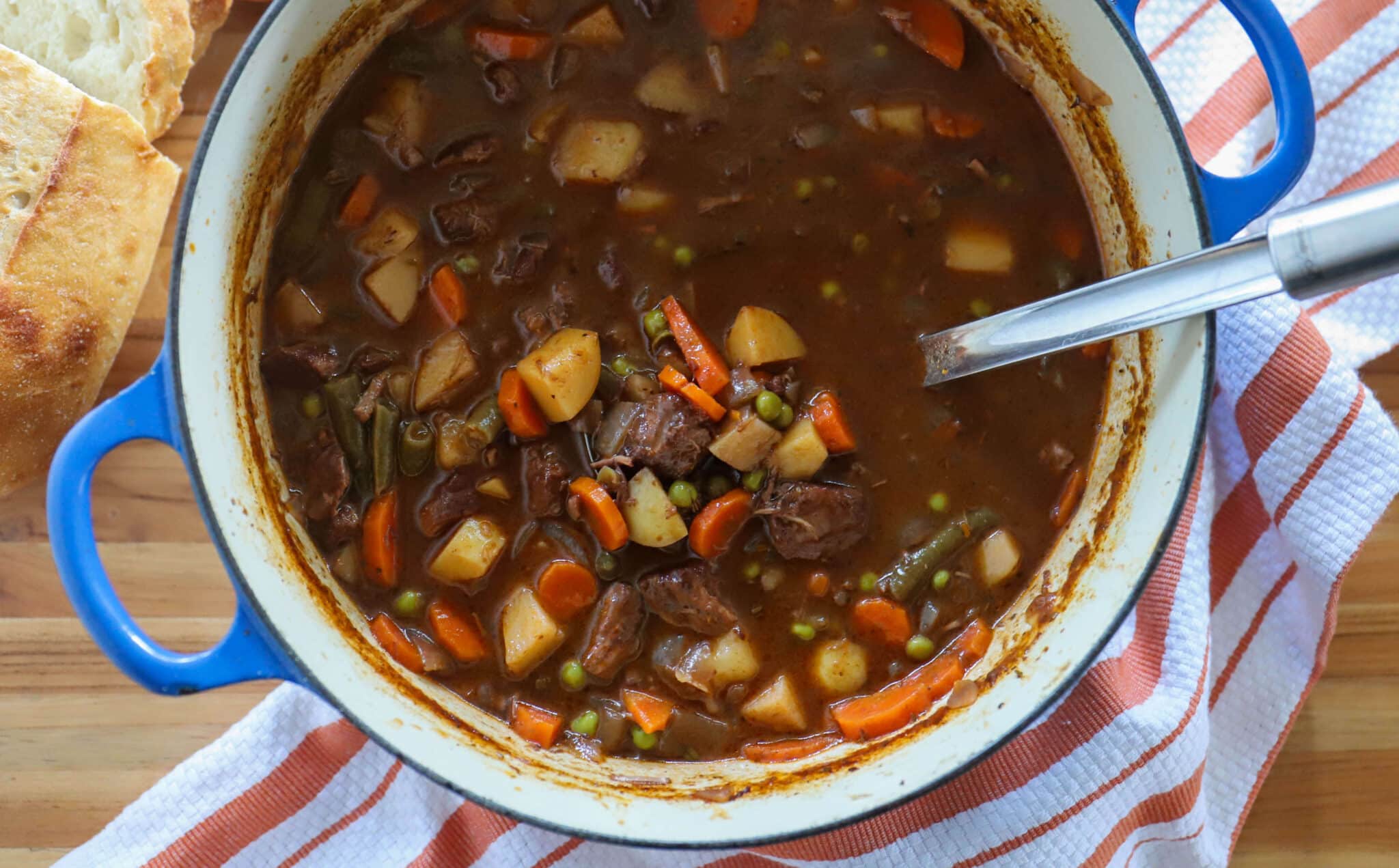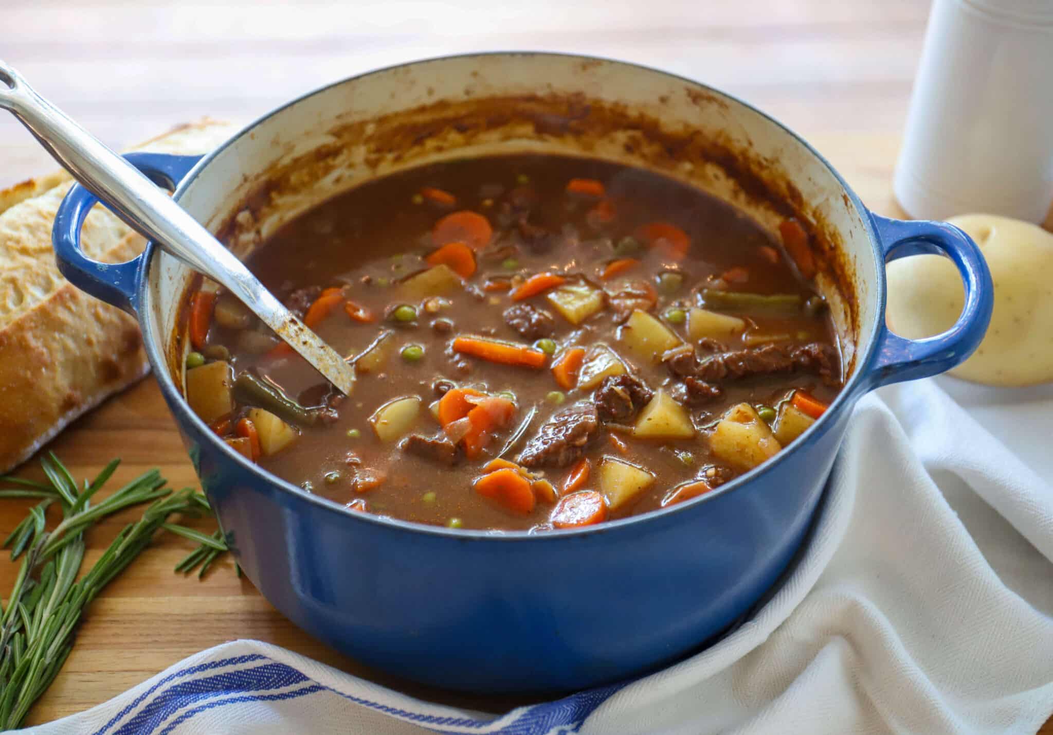 For vegetable portion of this beef and vegetable stew, carrots and potatoes are standard, but we add in frozen green beans and frozen peas for a pop of green color and extra vitamins and fiber.
