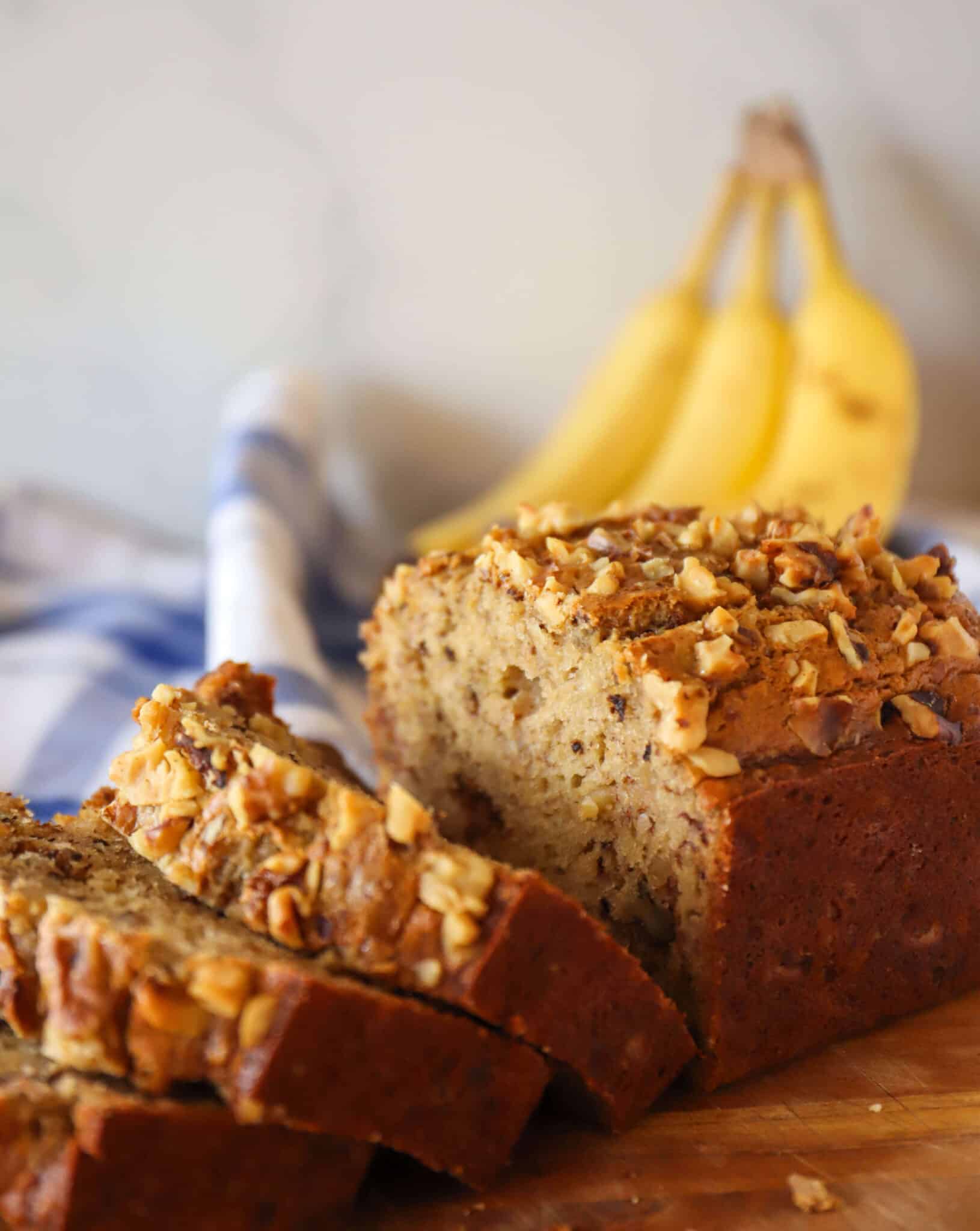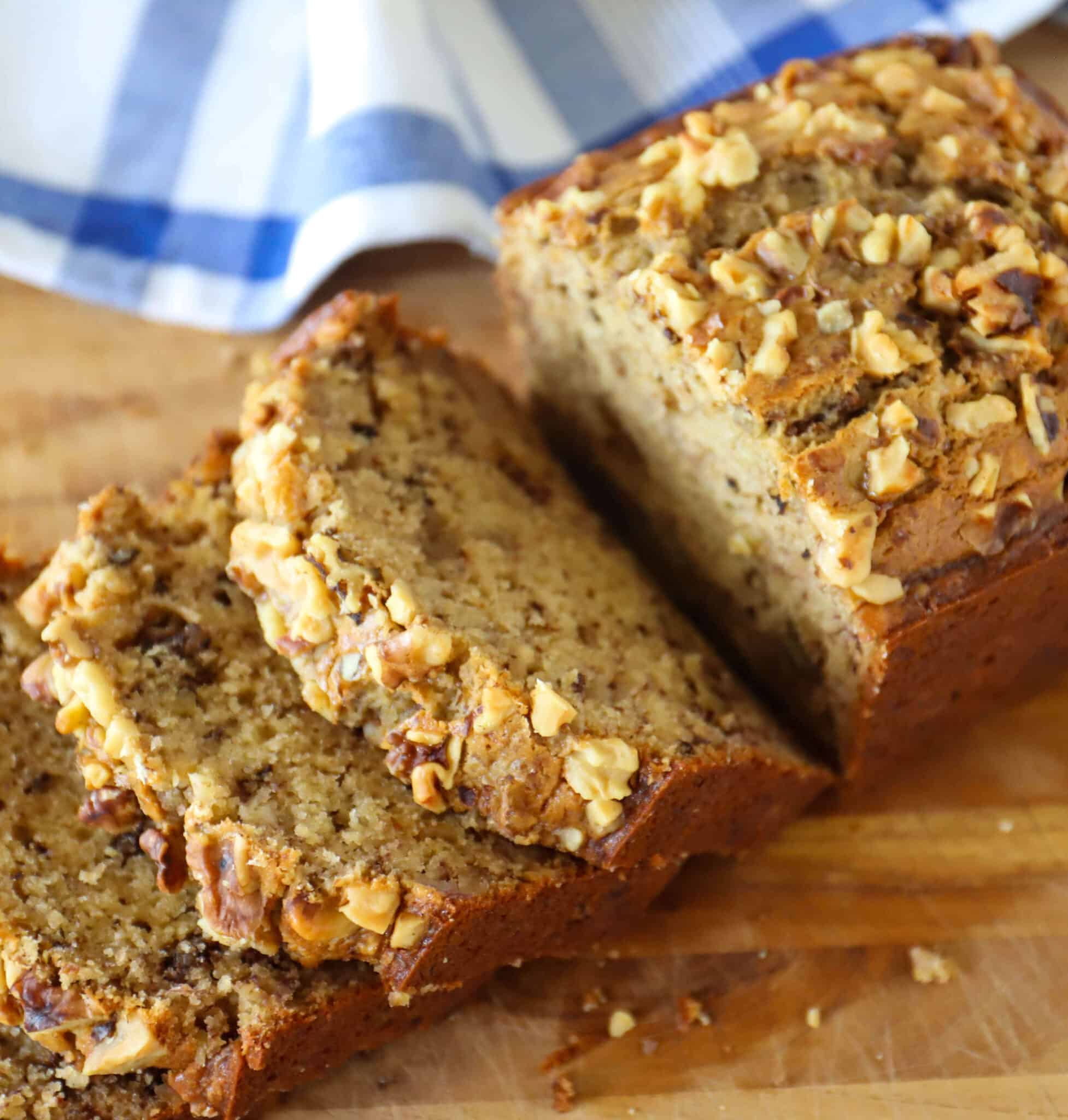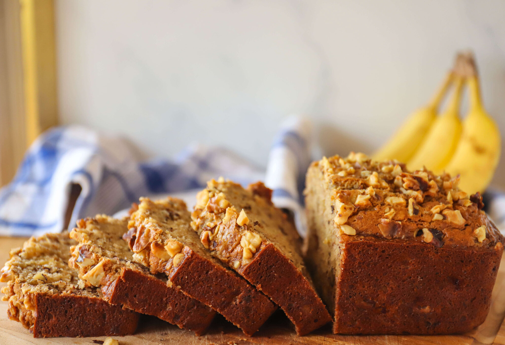 With real butter, three ripe bananas and a scoop of sour cream, this quick bread is wonderfully moist and full of rich banana flavor. We love it with walnuts mixed in and sprinkled on top, but you can leave them out if you prefer, or sub in chocolate chips.