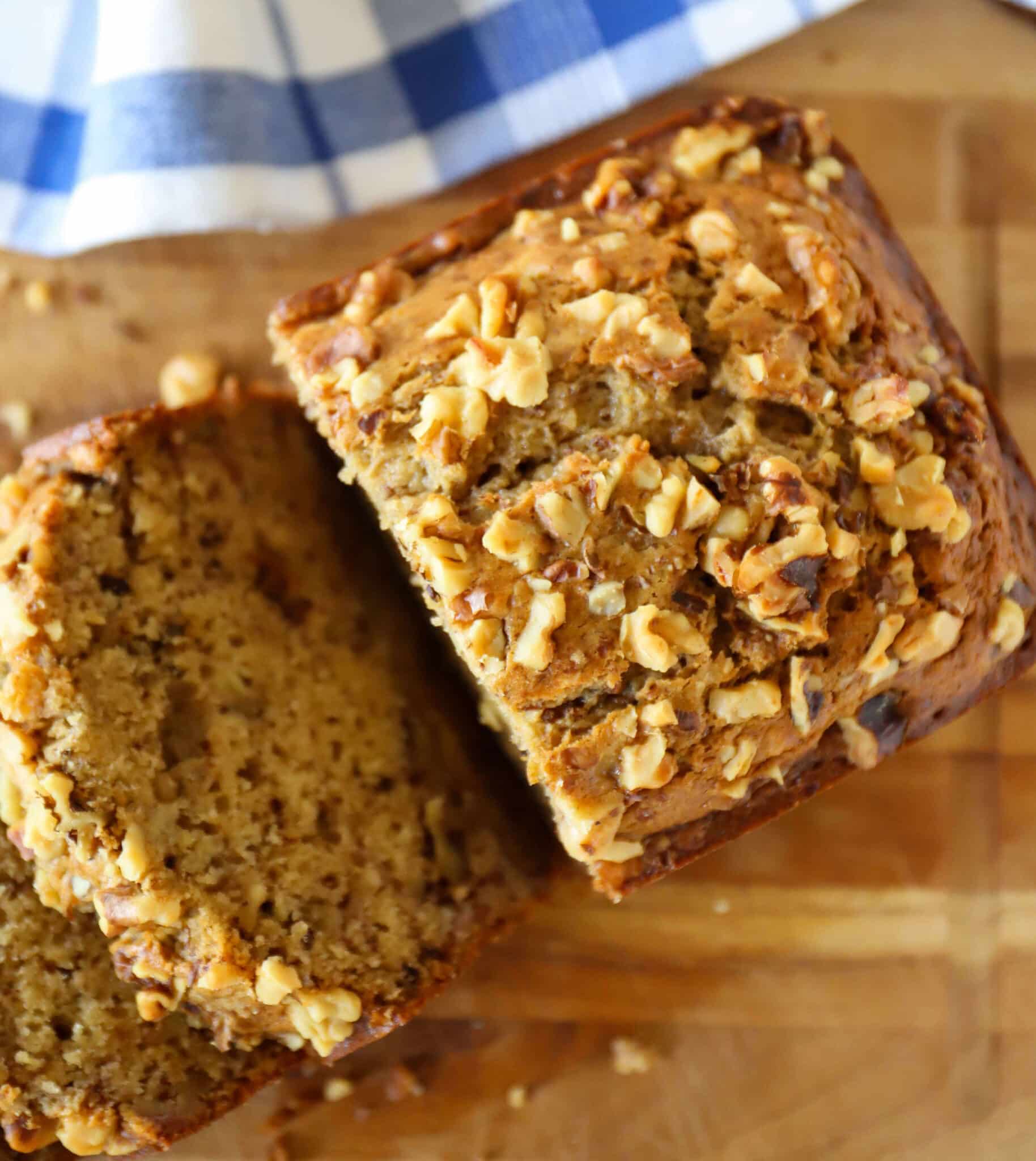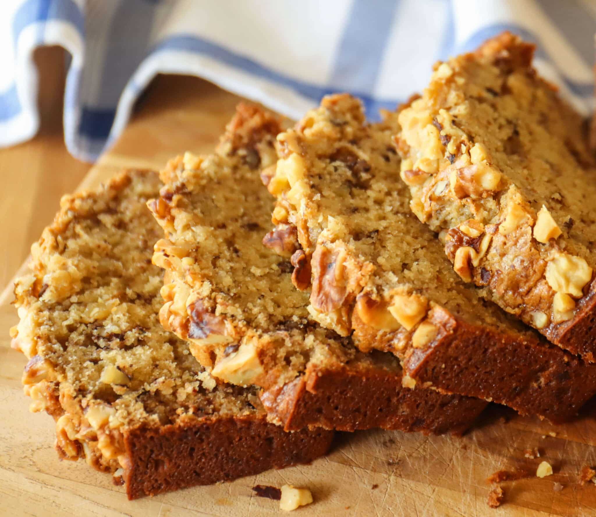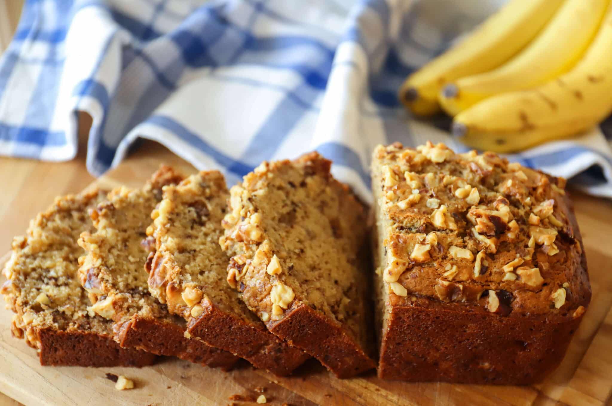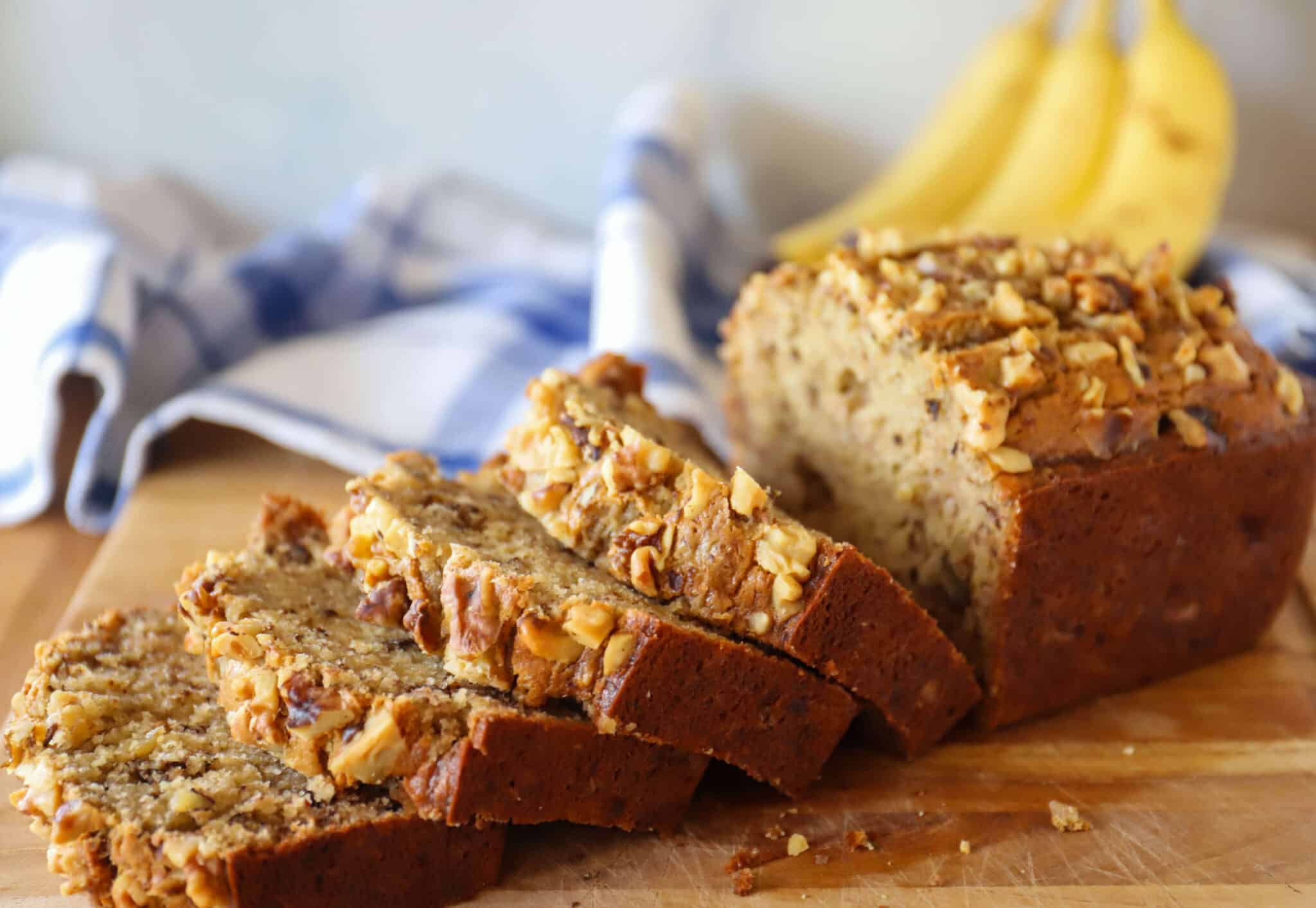 With real butter, three ripe bananas and a scoop of sour cream, this quick bread is wonderfully moist and full of rich banana flavor. We love it with walnuts mixed in and sprinkled on top, but you can leave them out if you prefer, or sub in chocolate chips.