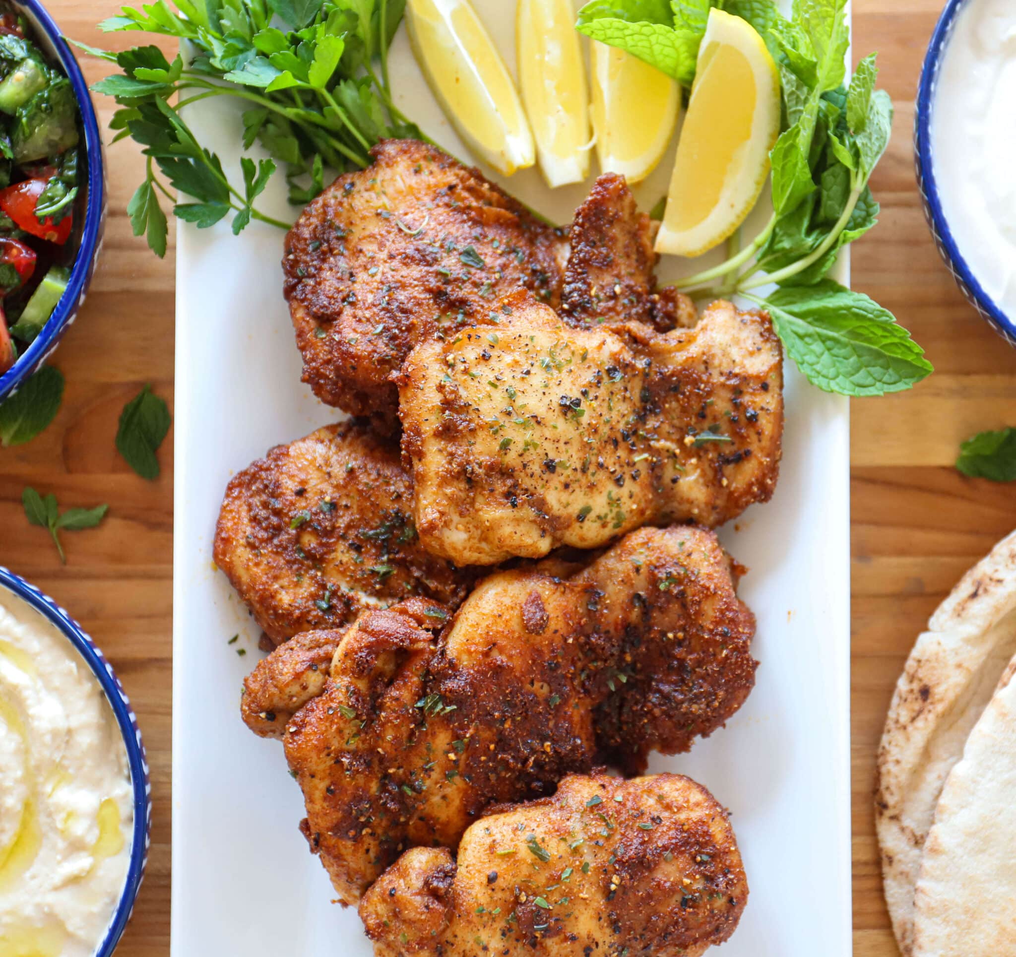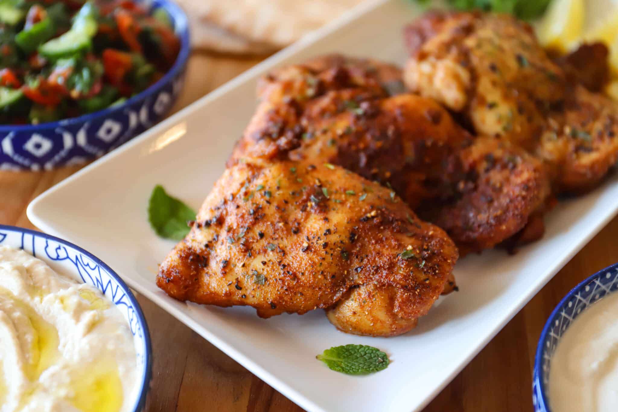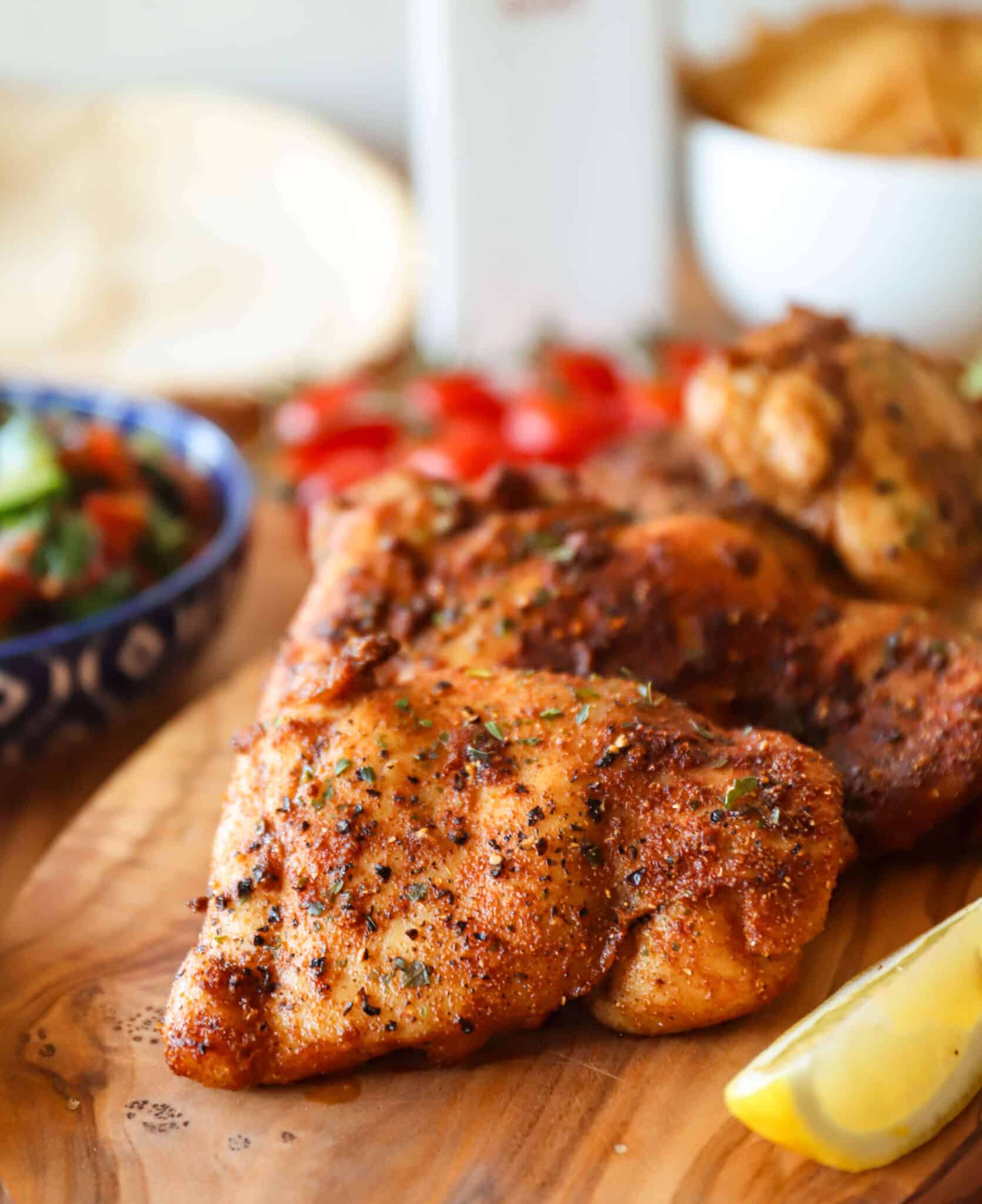 Serve this chicken, thinly sliced, stuffed in a pita with your favorite accompaniments: hummus, baba ganoush, toum, labne, lettuce, tomatoes, herbs, or pickles. Or spread it over a bed of greens with lemon vinaigrette. Or put it in a Greek grain bowl along with olives, cucumbers, tomatoes and red onion. Or alongside a lentils and side of rice! So many options. Enjoy!