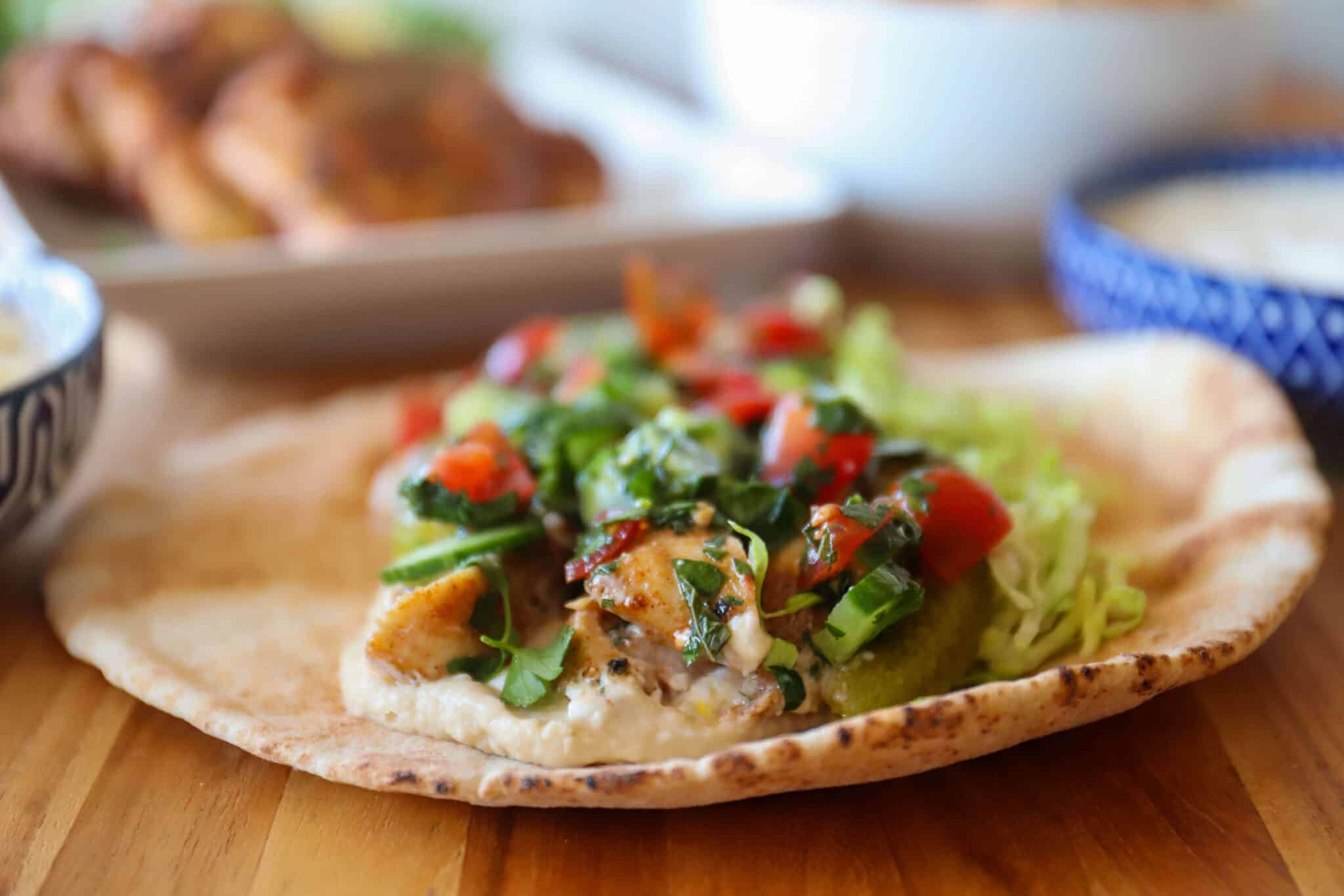 Chicken Shawarma is a popular middle eastern dish that is seasoned with warm spices and cooked on a rotating spit. (“Shawarma” means “turning” or “rotating” in Arabic.) So grab your rotating spit everyone! I’ll wait. … No rotating spit you say? Me neither. So this recipe isn’t truly chicken shawarma. It’s chicken schwarma-ish.