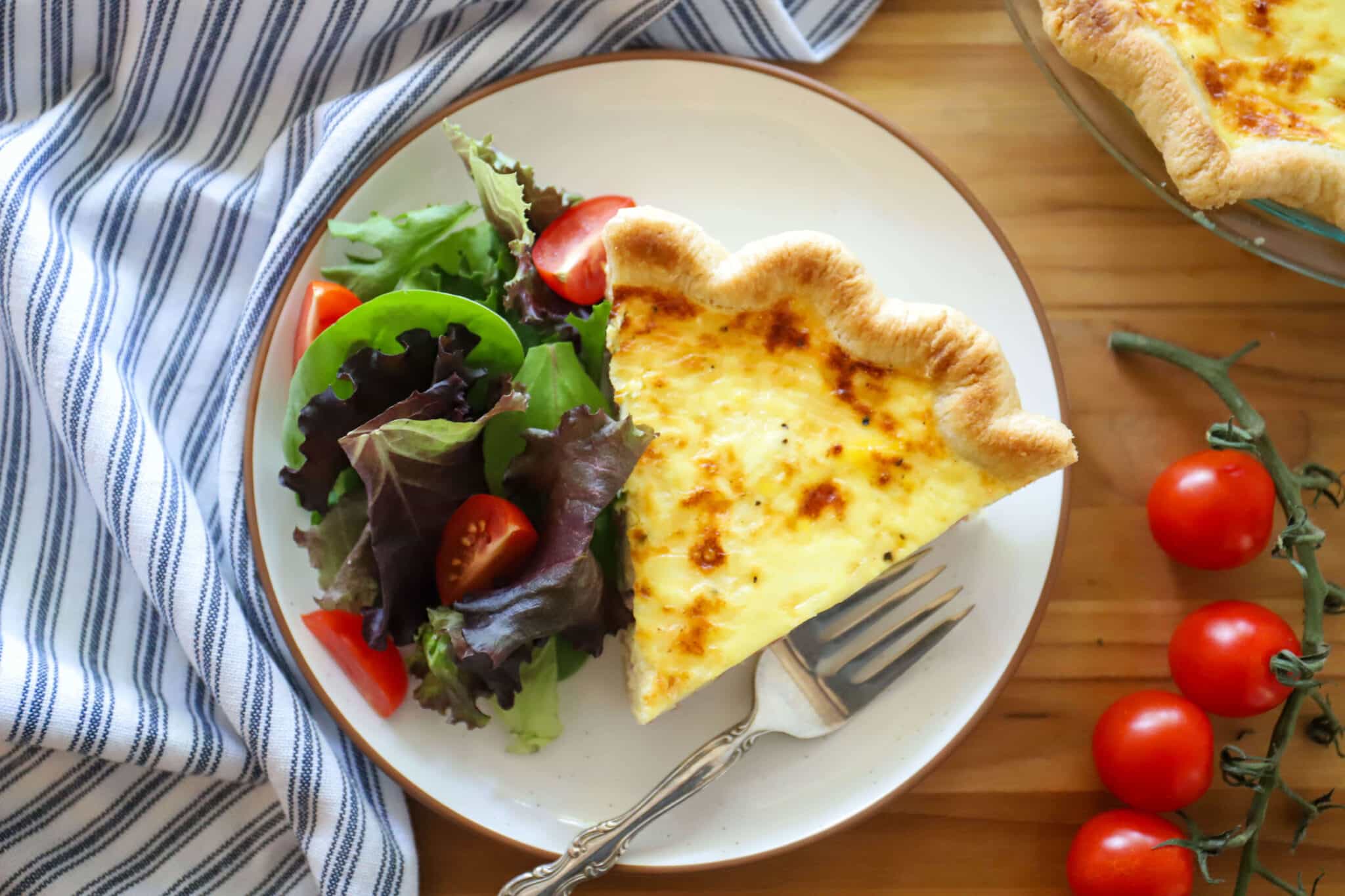 For serving, I love a simple salad made of mixed greens and cherry tomatoes, tossed with white balsamic vinegar and extra virgin olive oil, plus salt and pepper. The fresh greens, juicy tomatoes, and tart dressing provide just the right balance to the richness of the quiche.