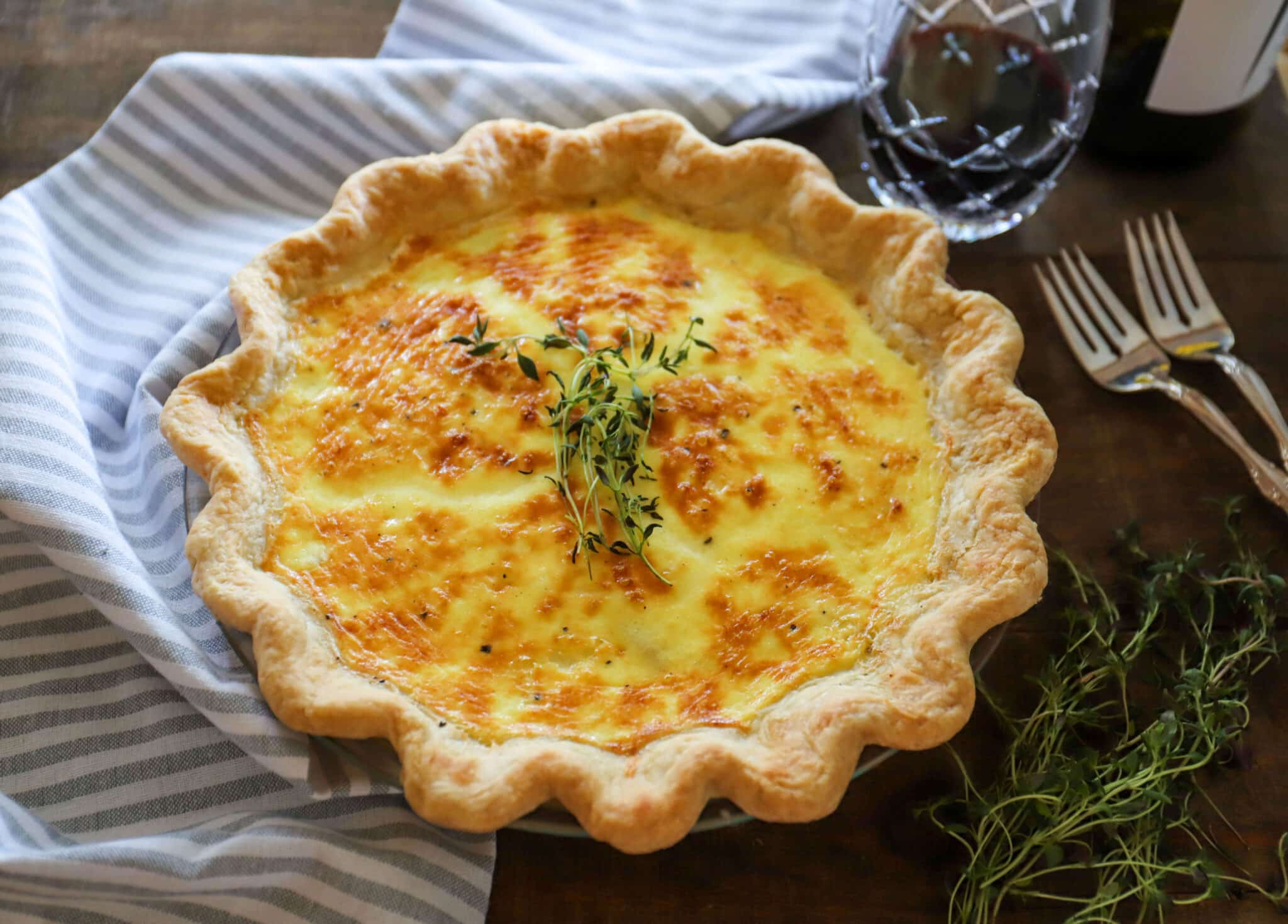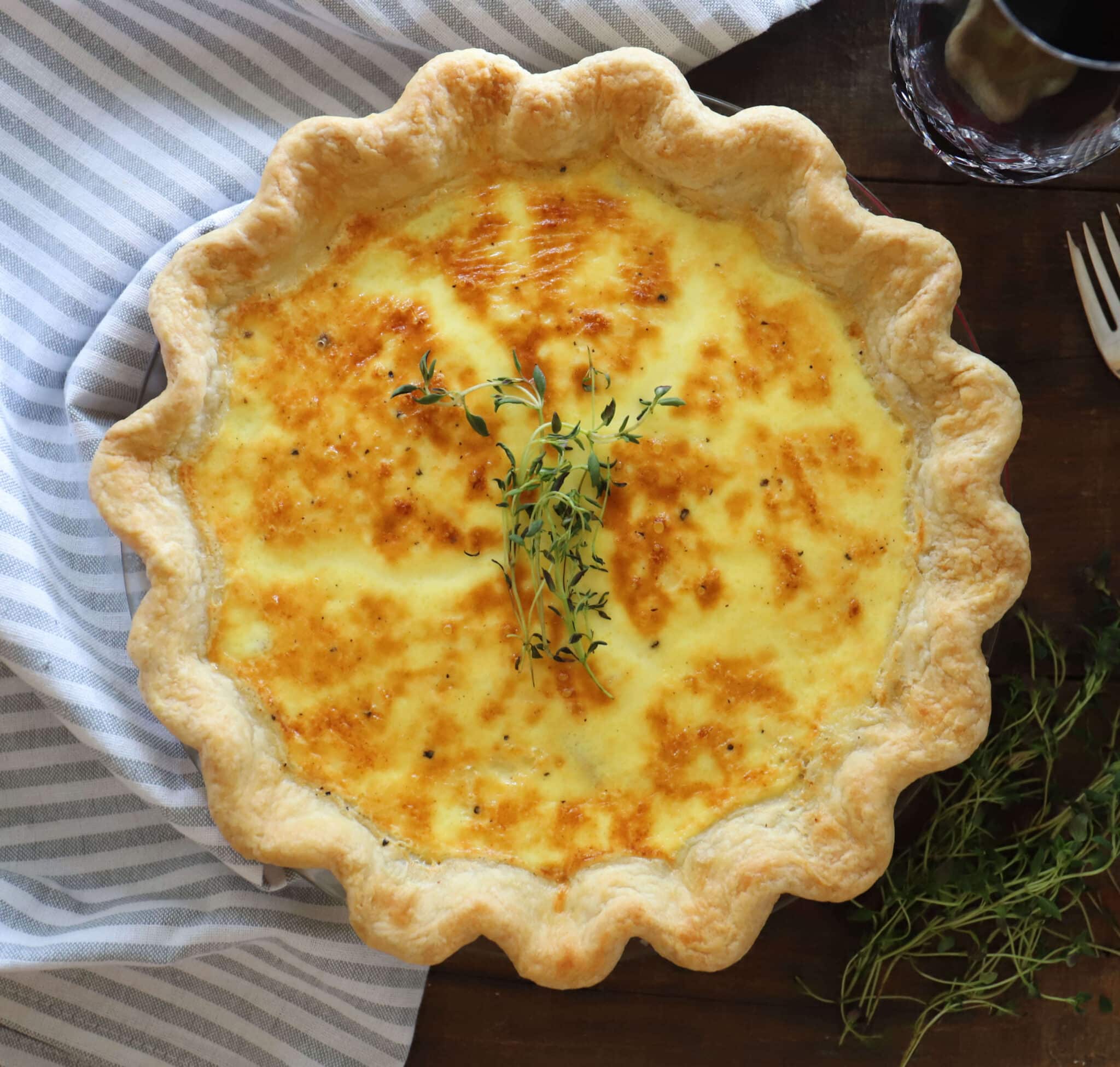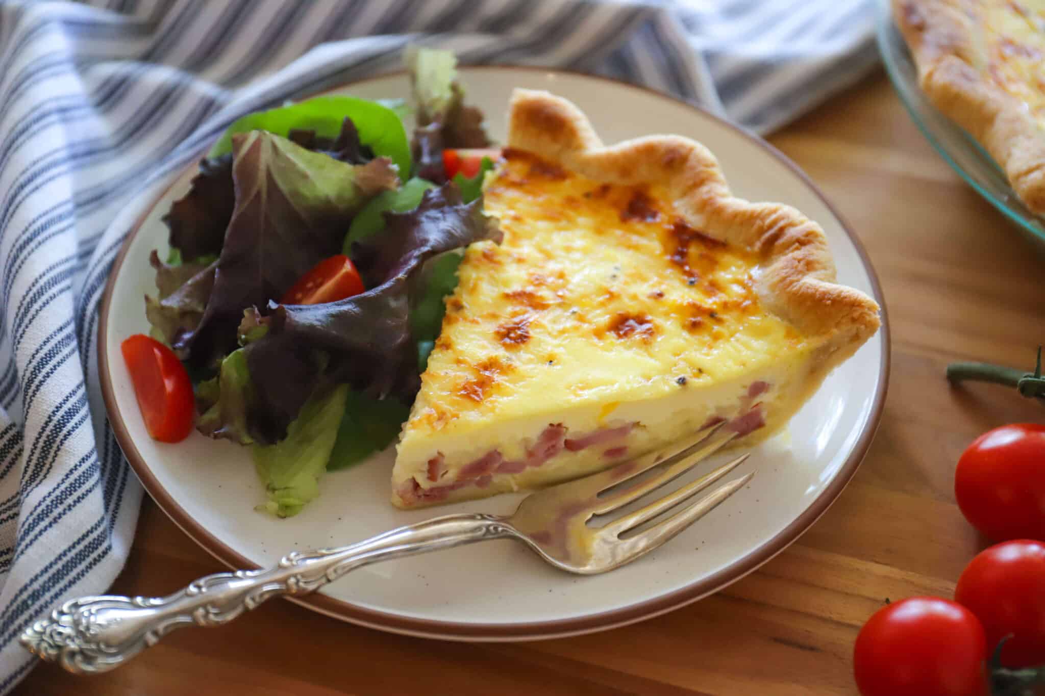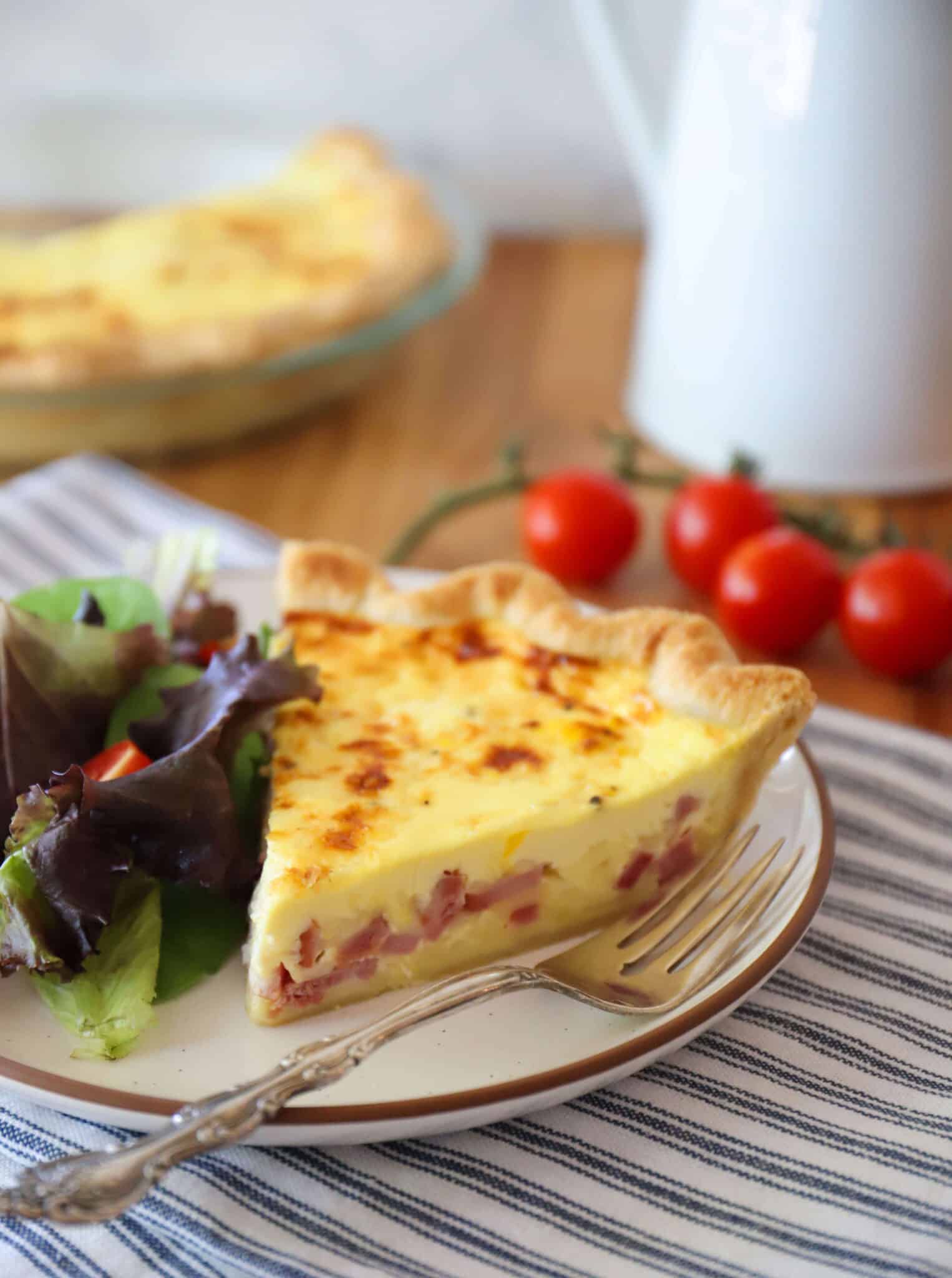 Quiche Lorraine is a classic French quiche. It’s made with ham or bacon and Swiss or Gruyere cheese, plus a creamy egg custard and a homemade pie crust.